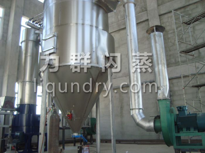 由于該產品的顆粒度要求在20-80目左右所以閃蒸干燥機的粉碎部分要做相應的調整,不能采用傳統的結構而且傳動電機的功率和轉速需采用變頻或調速儀控制。整套設備的進風溫度控制在150-160℃,出風溫度控制在70℃左右。物料有一定的粘性加料部分需采用雙螺旋加料機,整套設備在調試過程中一次性試車成功,一切技術要求全部達到設備運行穩定。